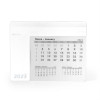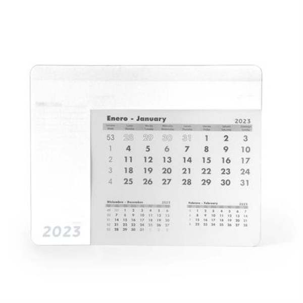 Rectangular mouse pad with calendar. Covered in a colour and transparent, after which you can see the corresponding sheet of the month. The cover is lifted to access the 12-sheet calendar in Spanish and English, the leaves of which are torn off. On each monthly sheet, the current month, the previous month, and the following month appear. Black slip-resistant base. Paper weight 80 g/m². Cover thickness 0.3 cm.Check the price of the 2026 mouse pad with your sales agent.