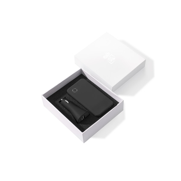Praktični set: Auto punjač i power bank 4000 mAh. Oba proizvoda obložena finim na dodir materijalom tip „soft touch”. Set je prikladan za većinu uređaja - npr. za GPS, MP3 i fotoaparat, koje koriste sučelje USB. Jedan i drugi proizvod imaju ugrađenu zaštitu od prekomjernog punjenja, pregrijavanja i pražnjenja. U kompletu: 1 x kabel USB Micro. Set pakiran u elegantnu kutiju. Materijal: ABS polikarbonat Preporučeni tisak: Tampontisak T4 (tamni podzemlje) /UV tisak 2