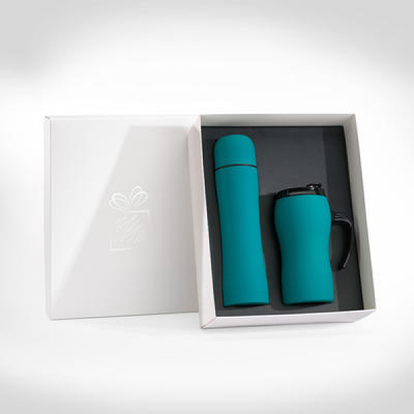 Vrlo praktični set - termo šalica i termos boca . Sudovi pokriveni izvana mekanom na dodir gumiranom oblogom „soft touch. Izrađeni od nehrđajućeg čelika. Kako šalica tako i termos boca imaju dvostruke stjenke koje održavaju željenu temperaturu. Set je certificiran za kontakt s hranom, ima također certifikat BPA FREE. Set pakiran u elegantnu kutiju. Materijal: guma, plastika, nehrđajući čelik Preporučeni tisak: Tampontisak T4 (svjetlo podzemlje) /UV tisak 3