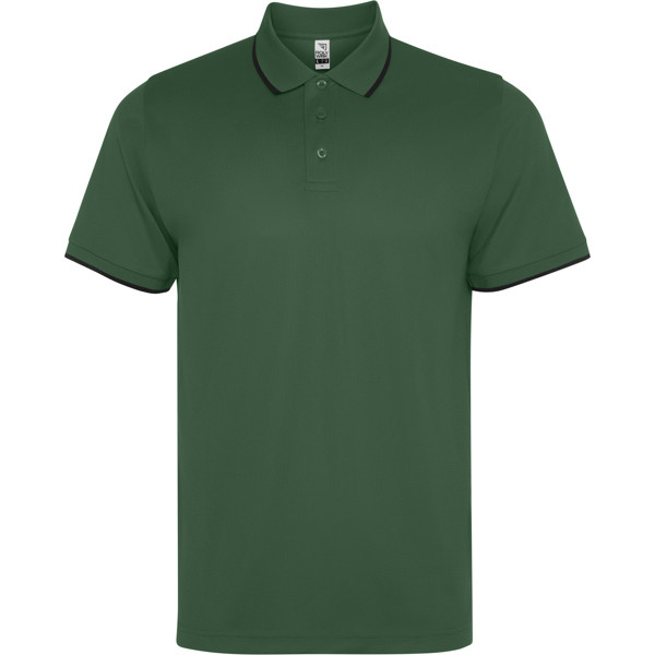 Technical unisex short-sleeved polo shirt. · 1x1 rib on collar and sleeves with contrasting colour detail. · 3-button placket.· Taped neckline in matching fabric.