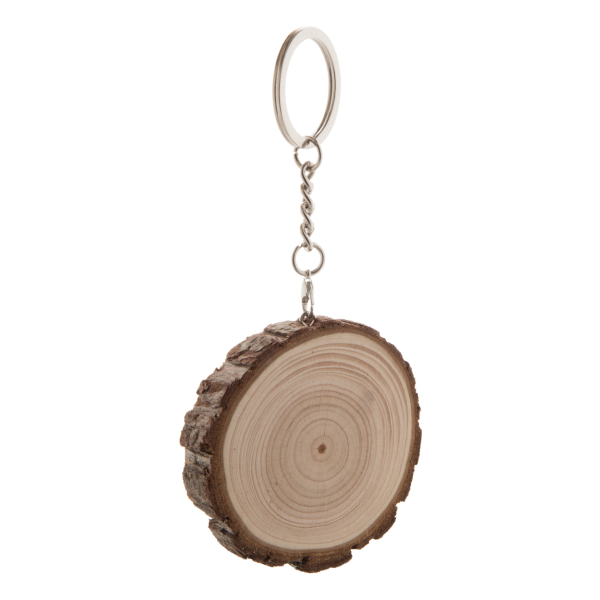 Pine wood keyring with bark and metal ring. Sizes may vary between products.