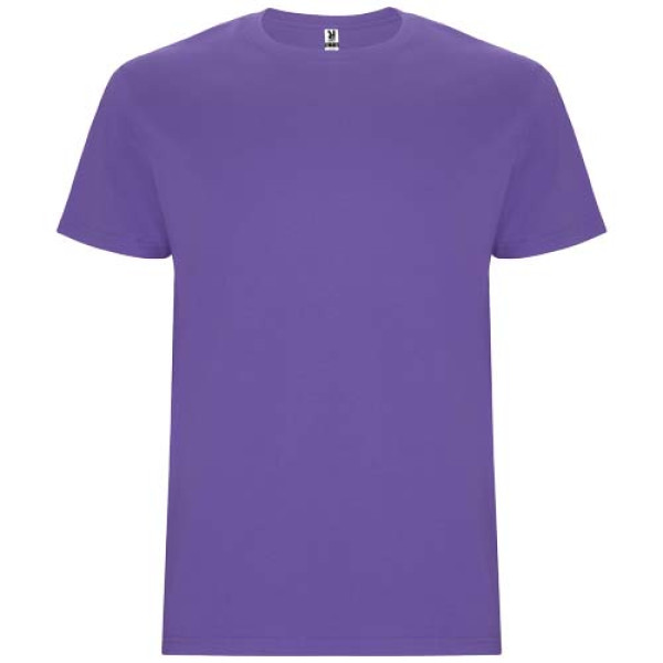 Tubular short-sleeved t-shirt in adult sizes and with side seams in kid's sizes. 1x1 ribbed round neck. Taped neckline in matching fabric.
