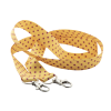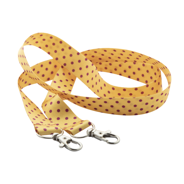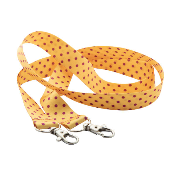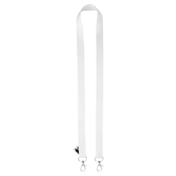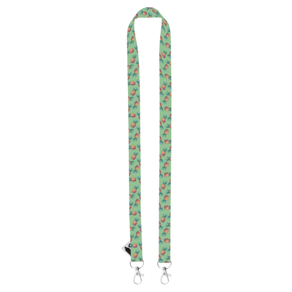 Custom made, RPET lanyard with 2 metal carabiners. With sublimation printed graphics on both sides. MOQ: 100 pcs.