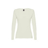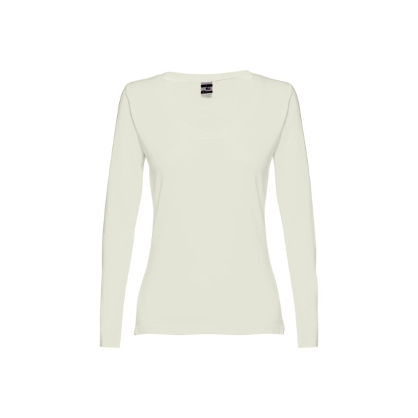 Ženska majica dugih rukava, 100% pamuk (150 g/m²), šivena iz tube. Boje 194, 195: 60% pamuk/40% poliester, boja 183: 90% pamuk/10% viskoza. Moderan kroj ima 1x1 rebrasti elastični ovratnik sa ojačanjem. Rezana i šivena i dupli štepovi na rukavima i dnu. Veličine: S, M, L, XL, XXL