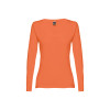 Ženska majica dugih rukava, 100% pamuk (150 g/m²), šivena iz tube. Boje 194, 195: 60% pamuk/40% poliester, boja 183: 90% pamuk/10% viskoza. Moderan kroj ima 1x1 rebrasti elastični ovratnik sa ojačanjem. Rezana i šivena i dupli štepovi na rukavima i dnu. Veličine: S, M, L, XL, XXL