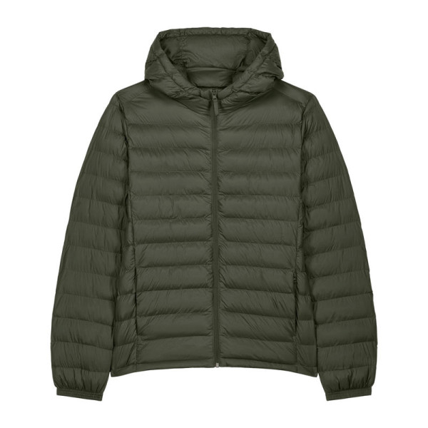 Set-in sleeve. High collar with grown on hood. Hood opening and bottom hem with adjustable plastic stopper and elastic cord. Reverse nylon zip at center front. Zipped welt pockets with extra grosgrain puller. Fully quilted. Side panels for better shape. Self fabric elasticated cuff. Inside seams with binding finish. Bottom hem with adjustable plastic stopper and elastic cord.