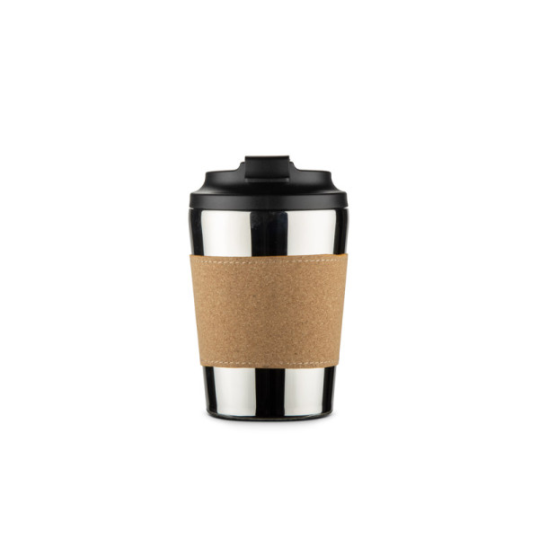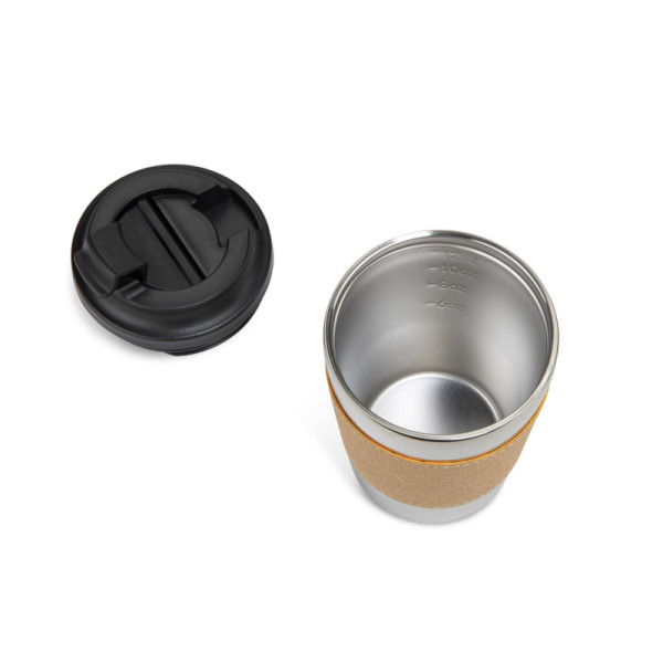 The 350ml CAFFEZ thermal mug combines a glossy steel finish with a natural cork band to create a sleek and modern coffee gadget. The graduated stainless steel interior makes it easy to measure your beverage, and the double-wall design helps maintain the temperature for up to 3 hours. The flip-top lid with top-opening flap provides convenient use on the go or in the office. The non-slip base increases stability on smooth surfaces. This is for brands that value aesthetics, quality and functionality in one.