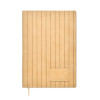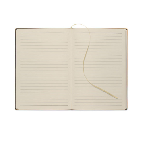 A5 notebook with soft smokey PU ribbed cover in 40% recycled post consumer and 60% PU with plain PU patch. 160 lined pages, 70gsm recycled paper (80 sheets). Matching colour polyester ribbon page marker.