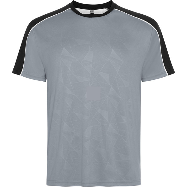 Sports set with short-sleeved T-shirt and shorts. Print on front panel. Piping on raglan sleeve seams. Mesh fabric detail in the centre back, left free for customization. Trousers in main fabric with side bands in breathable fabric. Contrast piping seams.