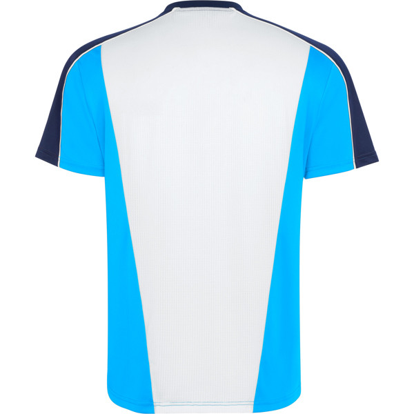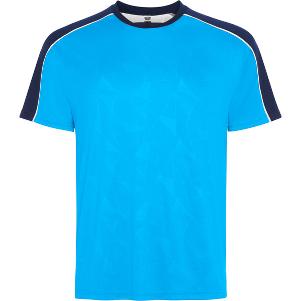 Sports set with short-sleeved T-shirt and shorts. Print on front panel. Piping on raglan sleeve seams. Mesh fabric detail in the centre back, left free for customization. Trousers in main fabric with side bands in breathable fabric. Contrast piping seams.