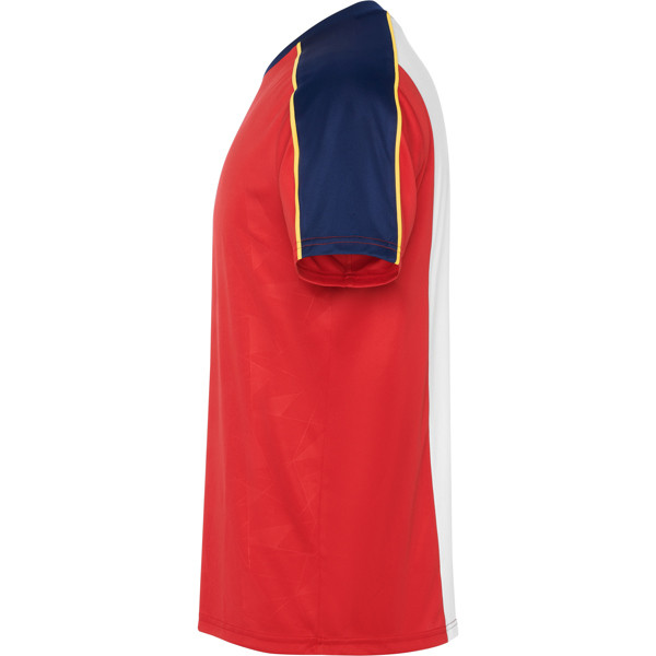 Sports set with short-sleeved T-shirt and shorts. Print on front panel. Piping on raglan sleeve seams. Mesh fabric detail in the centre back, left free for customization. Trousers in main fabric with side bands in breathable fabric. Contrast piping seams.