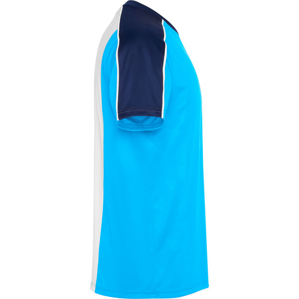 Sports set with short-sleeved T-shirt and shorts. Print on front panel. Piping on raglan sleeve seams. Mesh fabric detail in the centre back, left free for customization. Trousers in main fabric with side bands in breathable fabric. Contrast piping seams.
