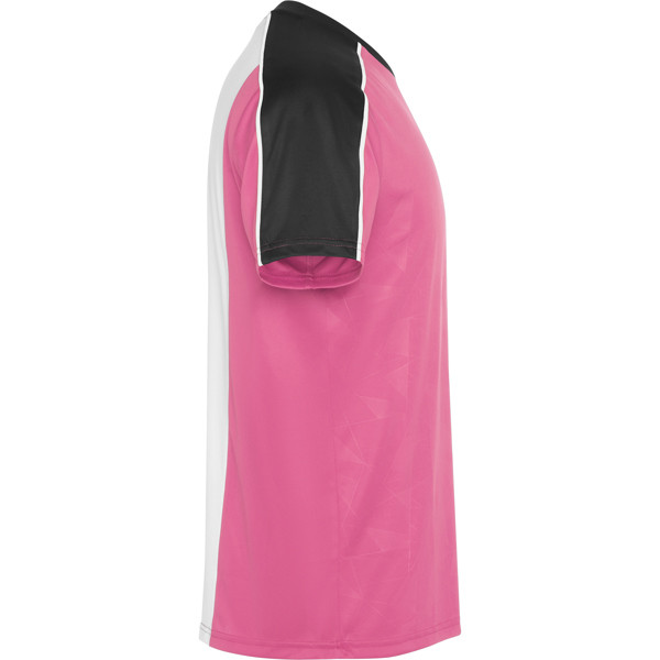 Sports set with short-sleeved T-shirt and shorts. Print on front panel. Piping on raglan sleeve seams. Mesh fabric detail in the centre back, left free for customization. Trousers in main fabric with side bands in breathable fabric. Contrast piping seams.