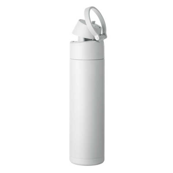 Double wall insulated recycled stainless steel (90% recycled stainless and 10% stainless steel) bottle. Features 2-in-1 straw and sip PP lid with handle. Leak-free. Capacity: 500 ml.