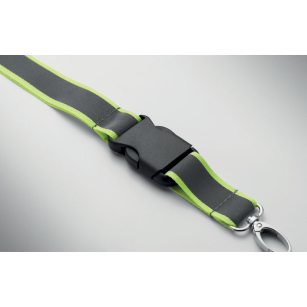 Reflective RPET polyester lanyard with 2.5 cm strap, metal hook, detachable PP buckle and safety breakaway. For promotional use only.