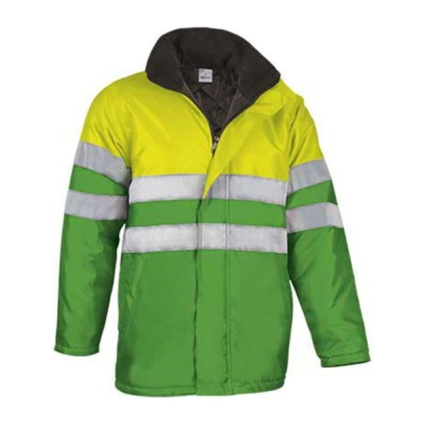 Outside waterproof fabric with polyurethane coating. Padded inside with lining 200 grs/m2. Sewn retroreflective bands around the body and arms. Central closure with double zip. Central placket with snap fasteners. Fleece-lined collar (more confortabl