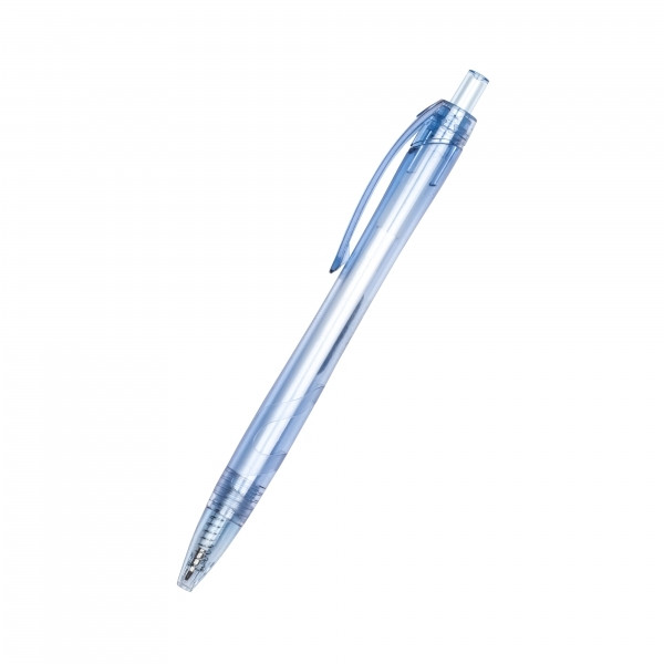 Environmentally friendly, transparent ball pen made of RPET with blue writing large capacity refill, straight clip, printing mechanism and RPET logo. Your logo is printed on the right of the clip.