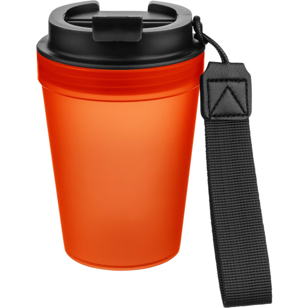 Transparent single-walled drinking mug with a 350 ml capacity and thick-walled design. Features a screw-on lid and a polyester wrist cord for easy carrying. Offering lightweight durability, strong impact resistance, and everyday reliability. Suitable for warm drinks, but please note that heat transfer may occur due to the single-wall construction. Not suitable for microwave or dishwasher use. Can be printed on the body.