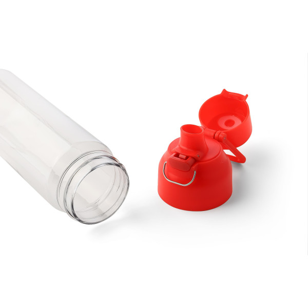 Tritan drinking bottle with 750 ml capacity, featuring a transparent body and colored lid. Made with durable, lightweight materials (PP) that resist moisture, chemicals, and everyday wear for long-lasting performance. Designed for daily use, it includes a secure button closure and a top carrying handle for easy transport. Suitable for work, school, or outdoor activities.