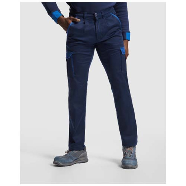 Long workwear trousers in a colour combination design. Comfortable and adjustable fabric. Back elastic waistband. Contrasting belt loops, flaps, pleats and trims. Two front pockets. Two pleated side pockets with flap and hook & loop fastening. Two back pockets with flap and hook & loop fastening.
