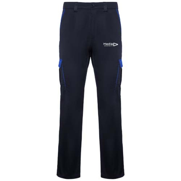Long workwear trousers in a colour combination design. Comfortable and adjustable fabric. Back elastic waistband. Contrasting belt loops, flaps, pleats and trims. Two front pockets. Two pleated side pockets with flap and hook & loop fastening. Two back pockets with flap and hook & loop fastening.