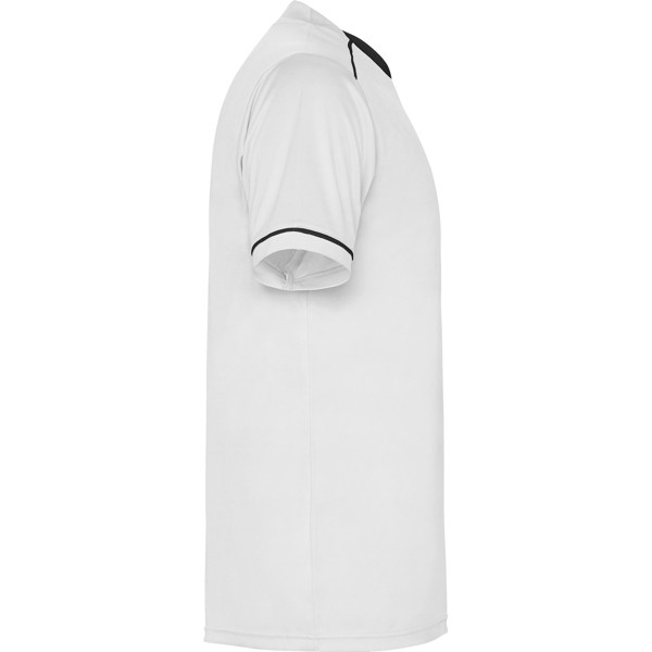 Sports set with t-shirt and shorts.1.- T-shirt with fantasy double collar in v-neck finish and reinforced covered seams.2.- Shoulder with contrasting ornamental rib.3.- Short-sleeve with contrasting ribbed slit and trim motif.4.- Shorts with elastic waistband, adjustable drawcord and safety stitching to fasten the cord.