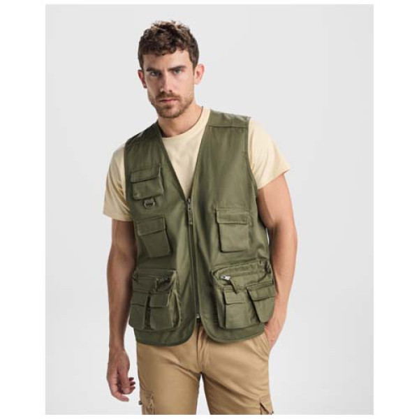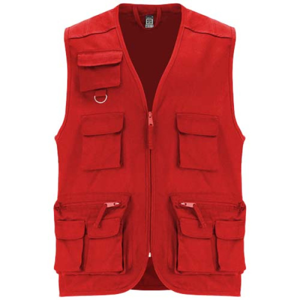 Multi-pocket work vest with v-neck. Front zip with puller. Three chest pockets with flap and hook & loop fastening. Upper pocket with multifunction ring. Two side pockets with zip and puller, with two overlapping pockets with flap and hook & loop fastening. Two back pockets with flap and hook & loop fastening. Neck, armholes and hem with trim.